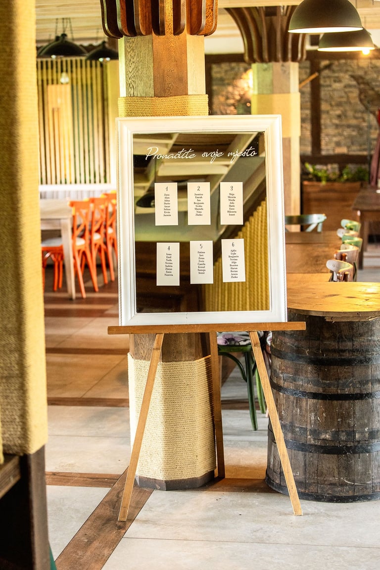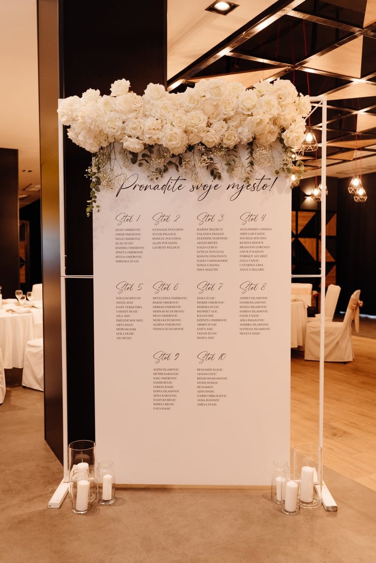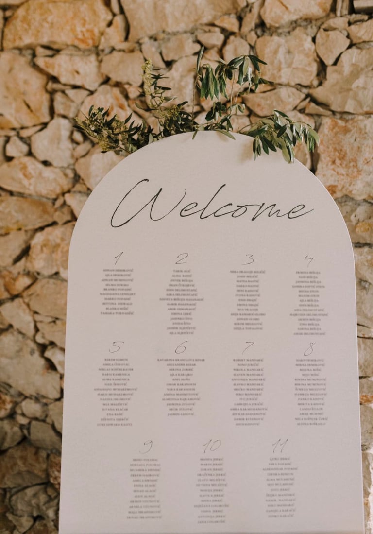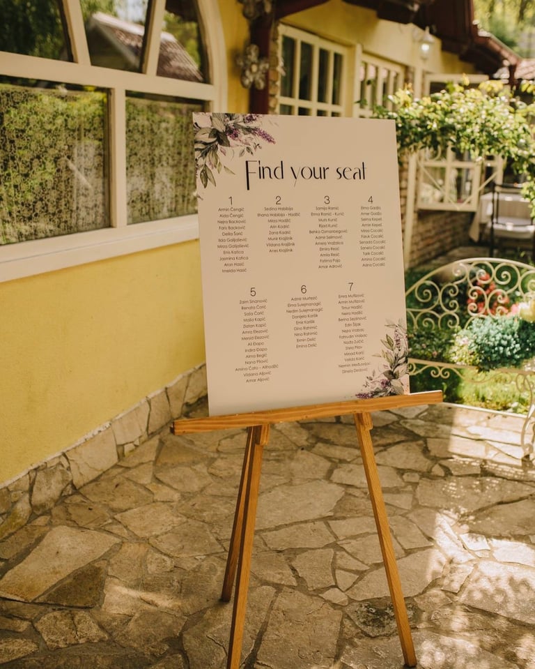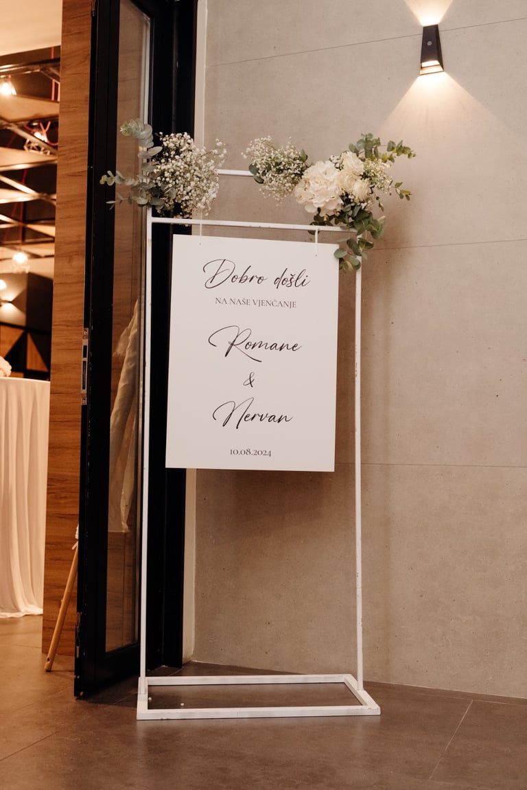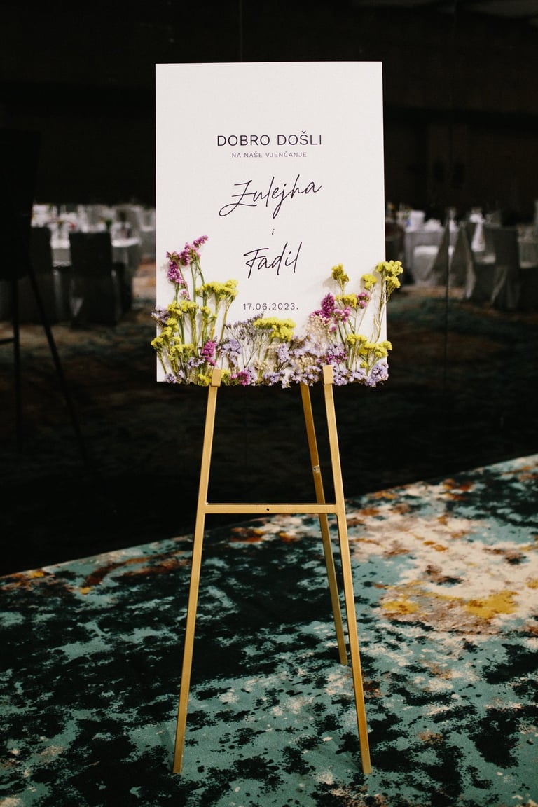 Tabla dobrodošlice i raspored sjedenja nisu samo informativni detalji – oni su dio cjelokupnog vizualnog doživljaja, usklađeni s estetikom vašeg posebnog dana.