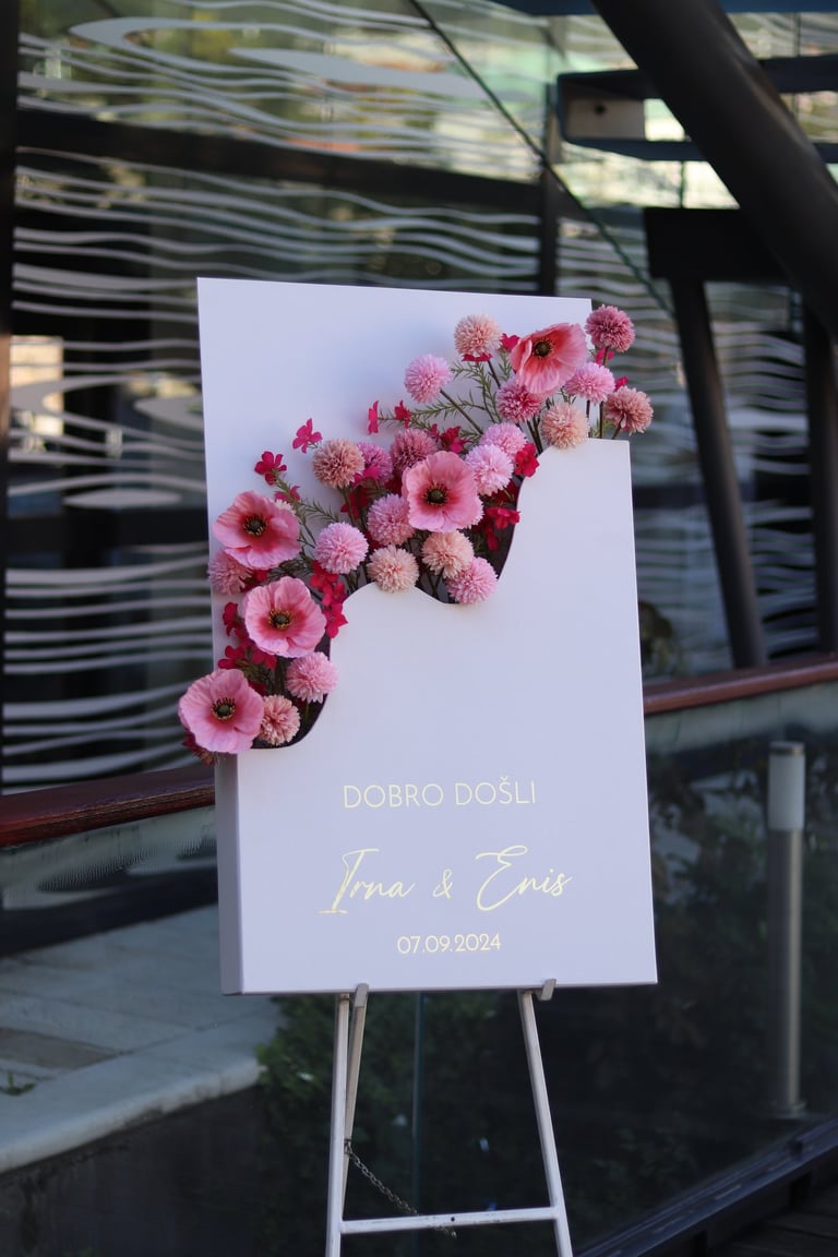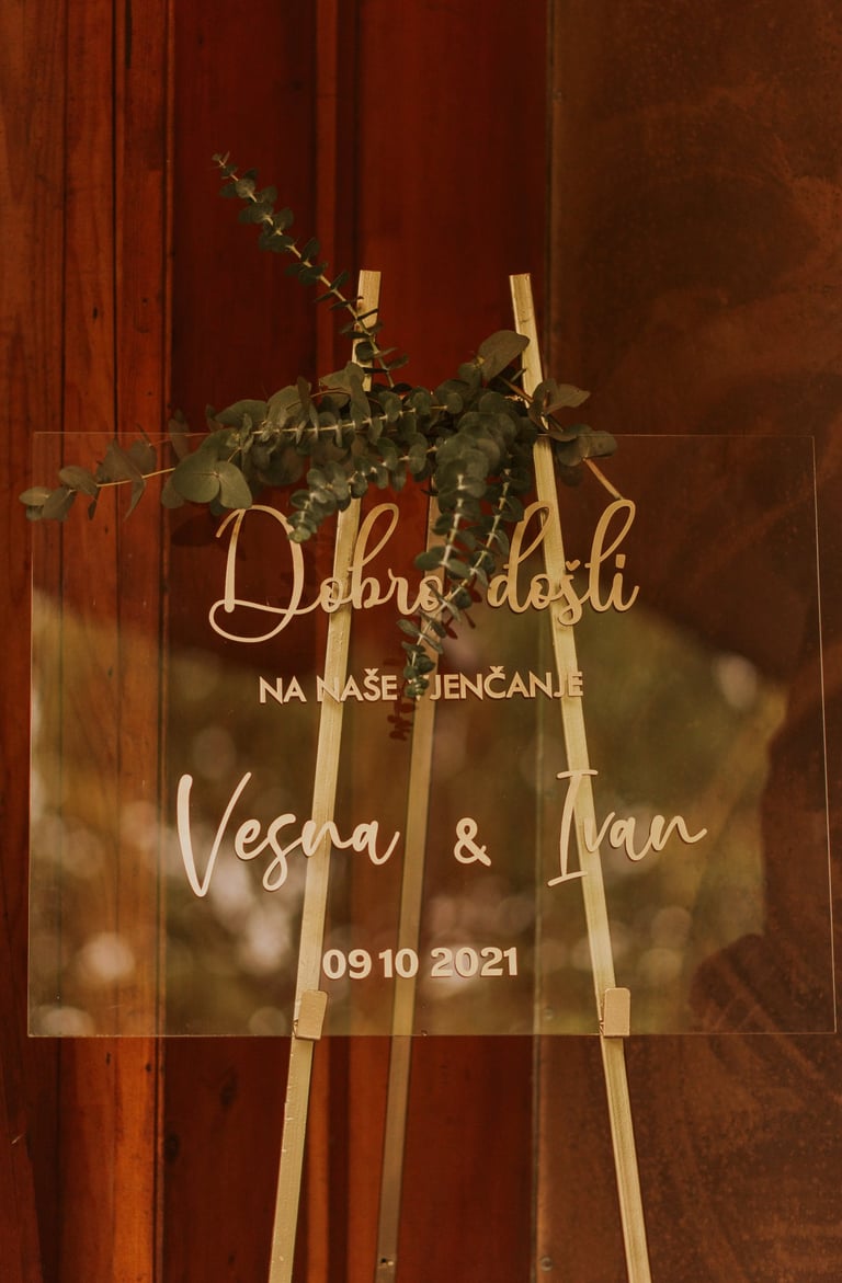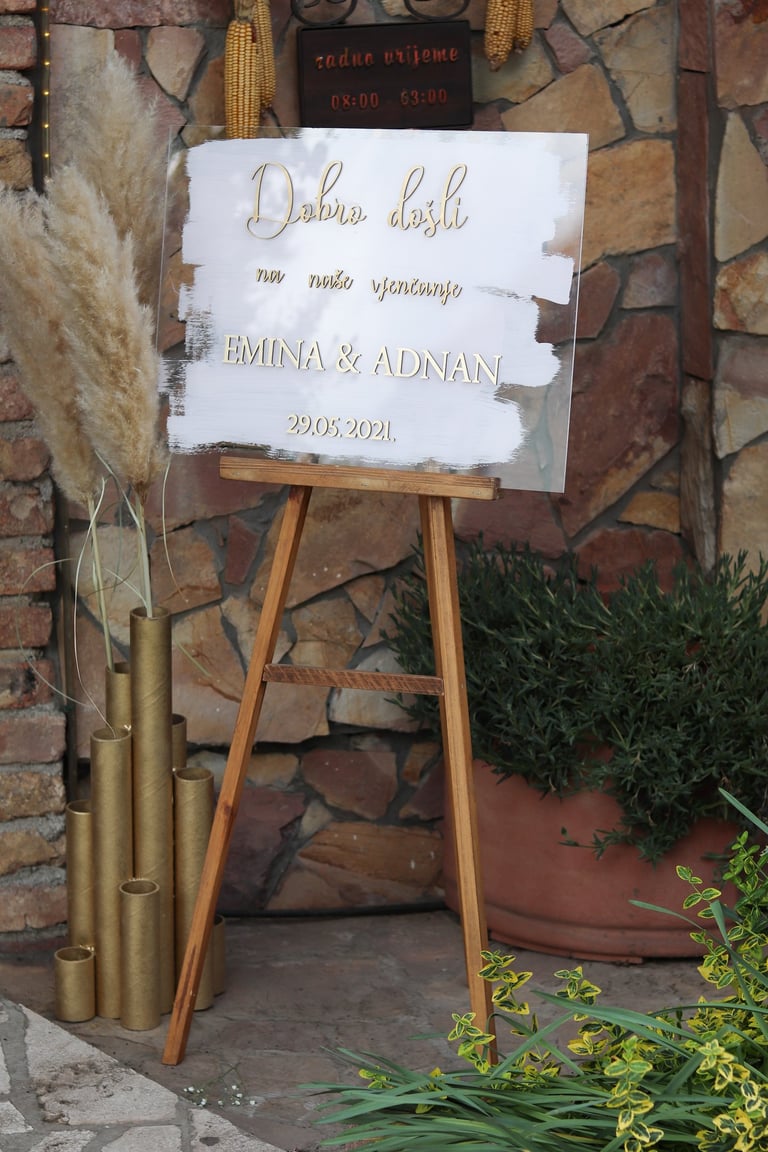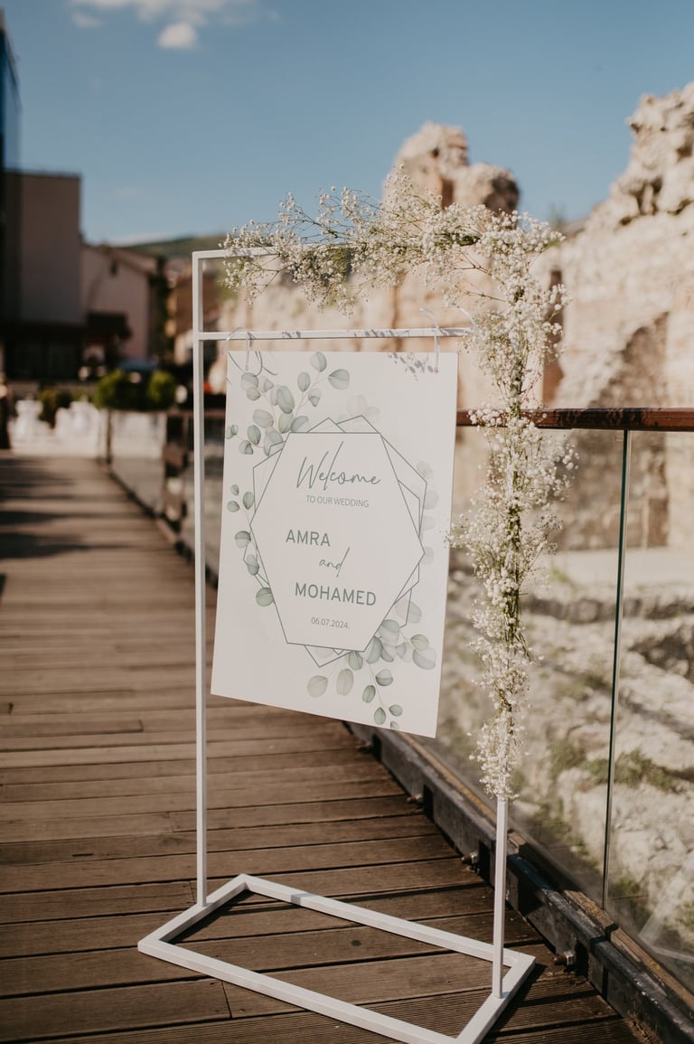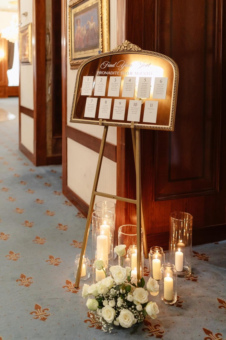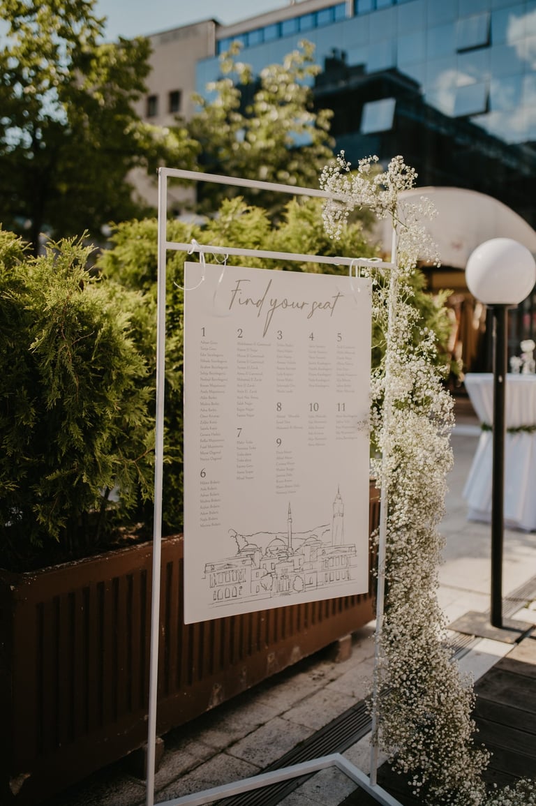 Tabla dobrodošlice i raspored sjedenja nisu samo informativni detalji – oni su dio cjelokupnog vizualnog doživljaja, usklađeni s estetikom vašeg posebnog dana.
