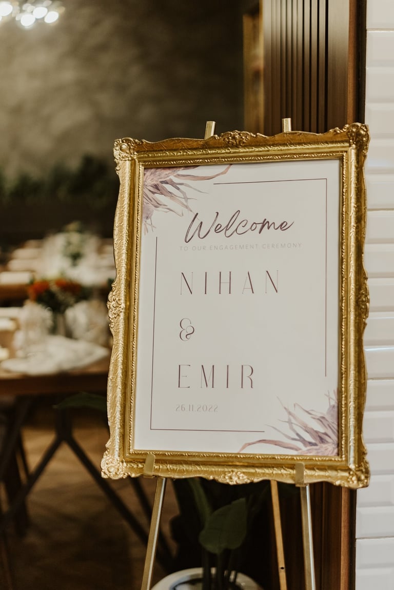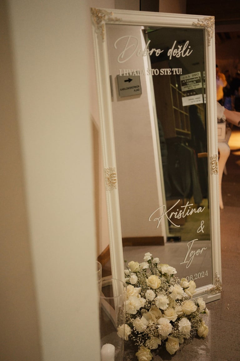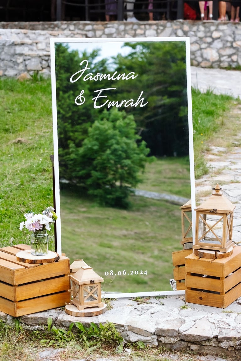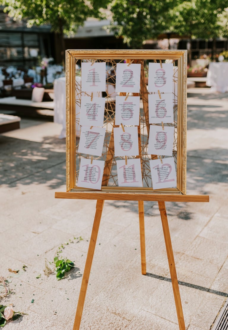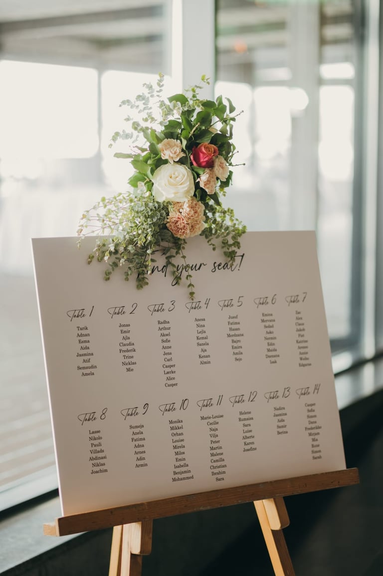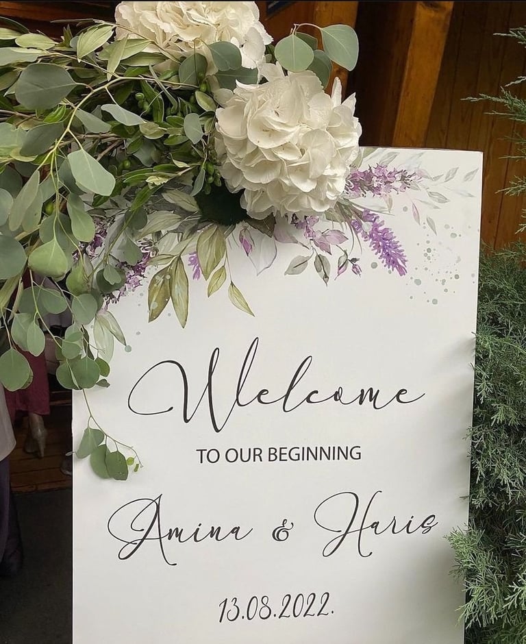 Tabla dobrodošlice i raspored sjedenja nisu samo informativni detalji – oni su dio cjelokupnog vizualnog doživljaja, usklađeni s estetikom vašeg posebnog dana.