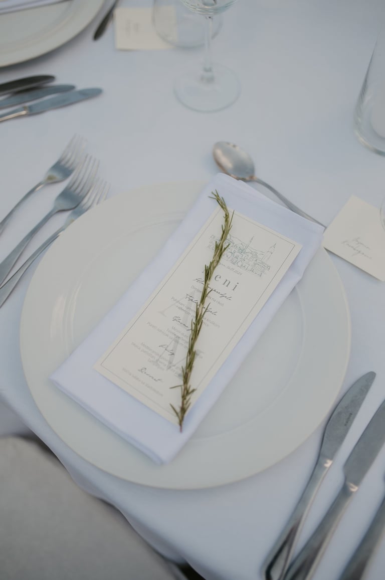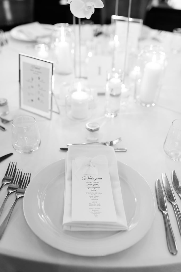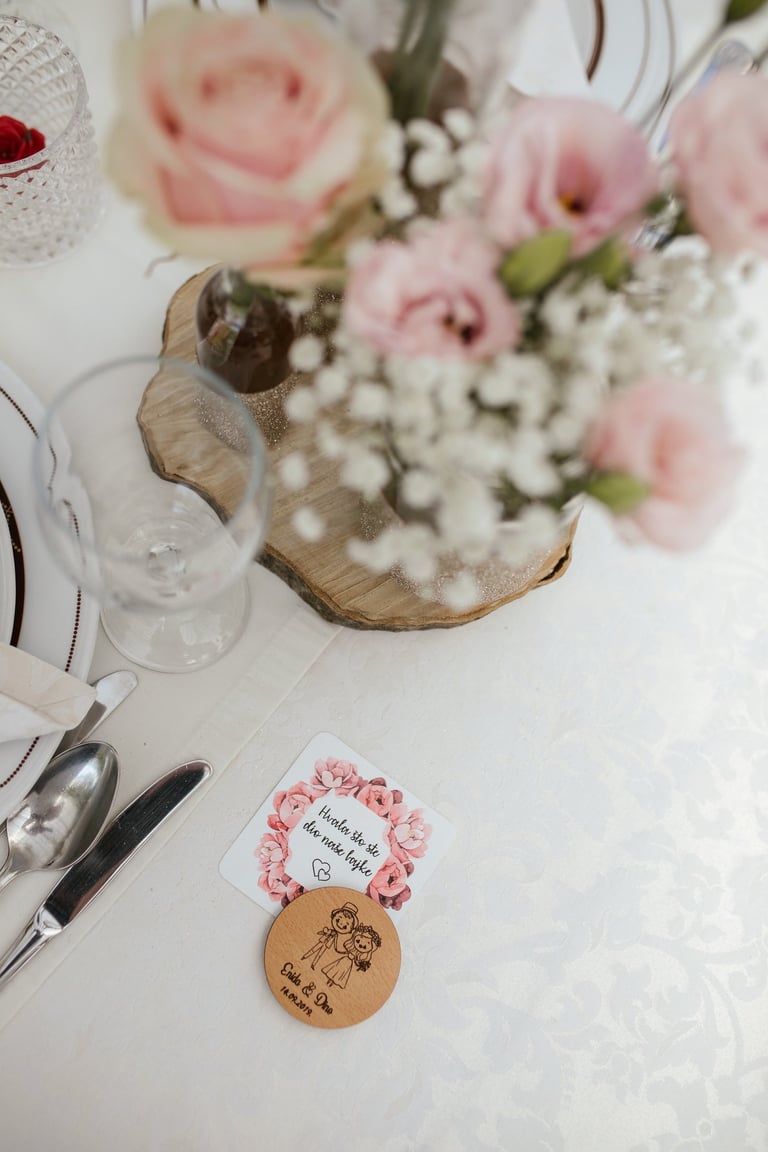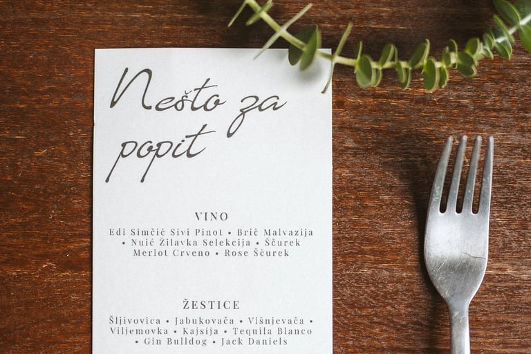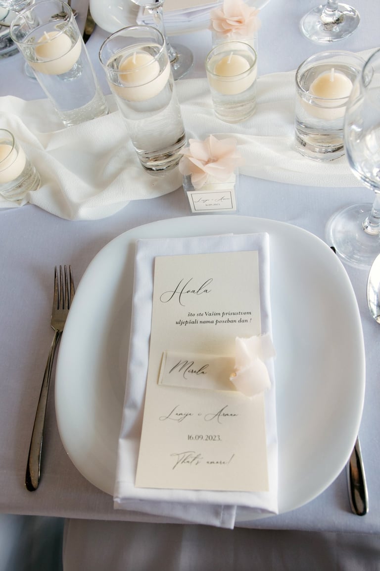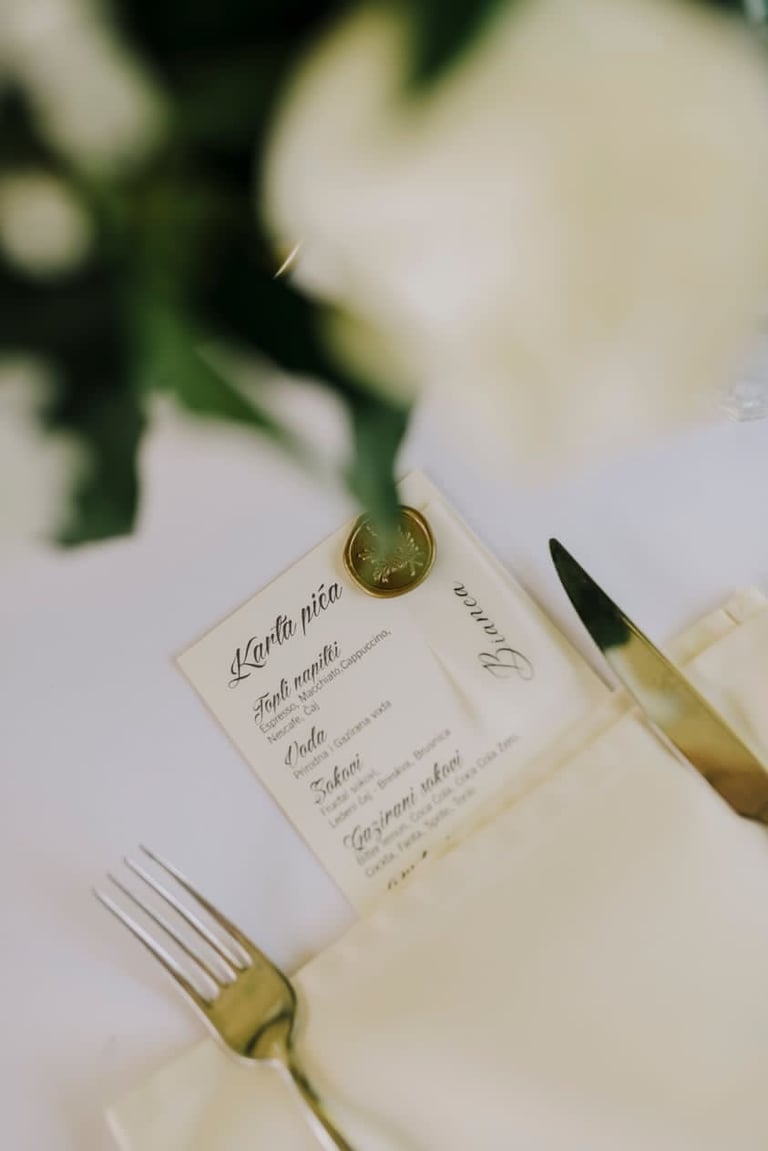 Printani materijal i dekorativni detalji dodatno upotpunjuju cjelokupni dojam vjenčanja i osiguravaju usklađenost svih elemenata. Izrađujemo kartice s menijem, rasporedom sjedenja, protokolom i pićima, kao i personalizirane zahvalnice za goste. Posebnu pažnju posvećujemo usklađivanju dizajna s ostalim dekorativnim elementima, koristeći kvalitetne materijale i sofisticirane tehnike printa. Svaki detalj izrađuje se s ciljem da vjenčanje izgleda besprijekorno i ostavi trajnu uspomenu.