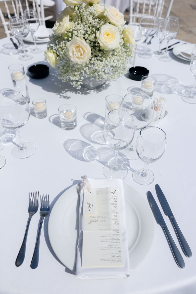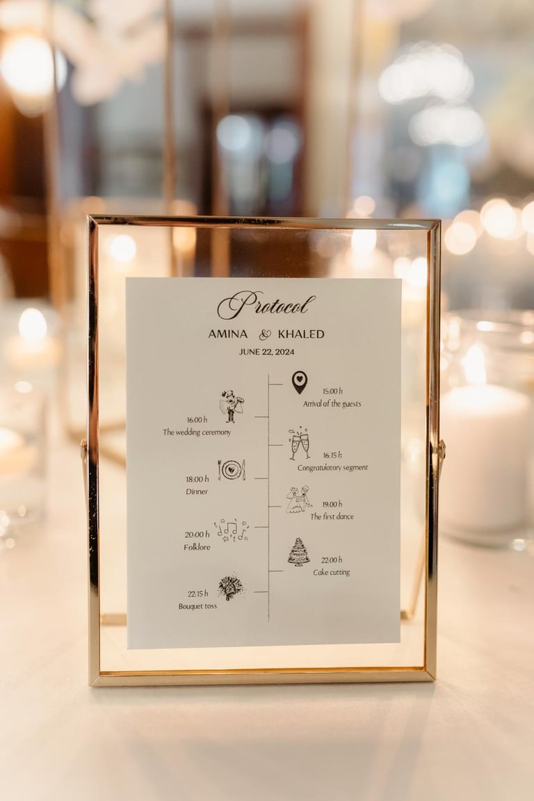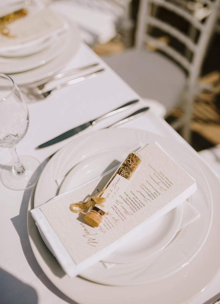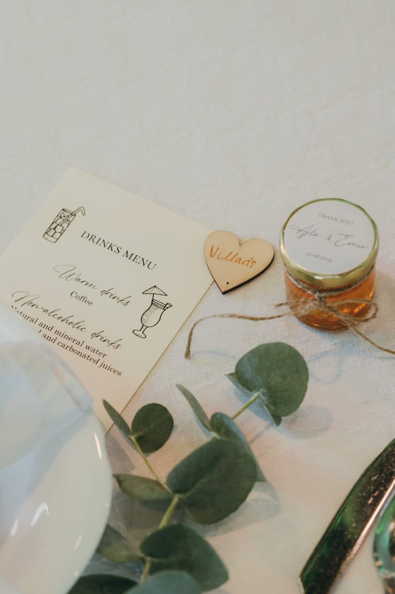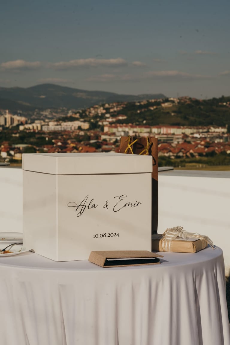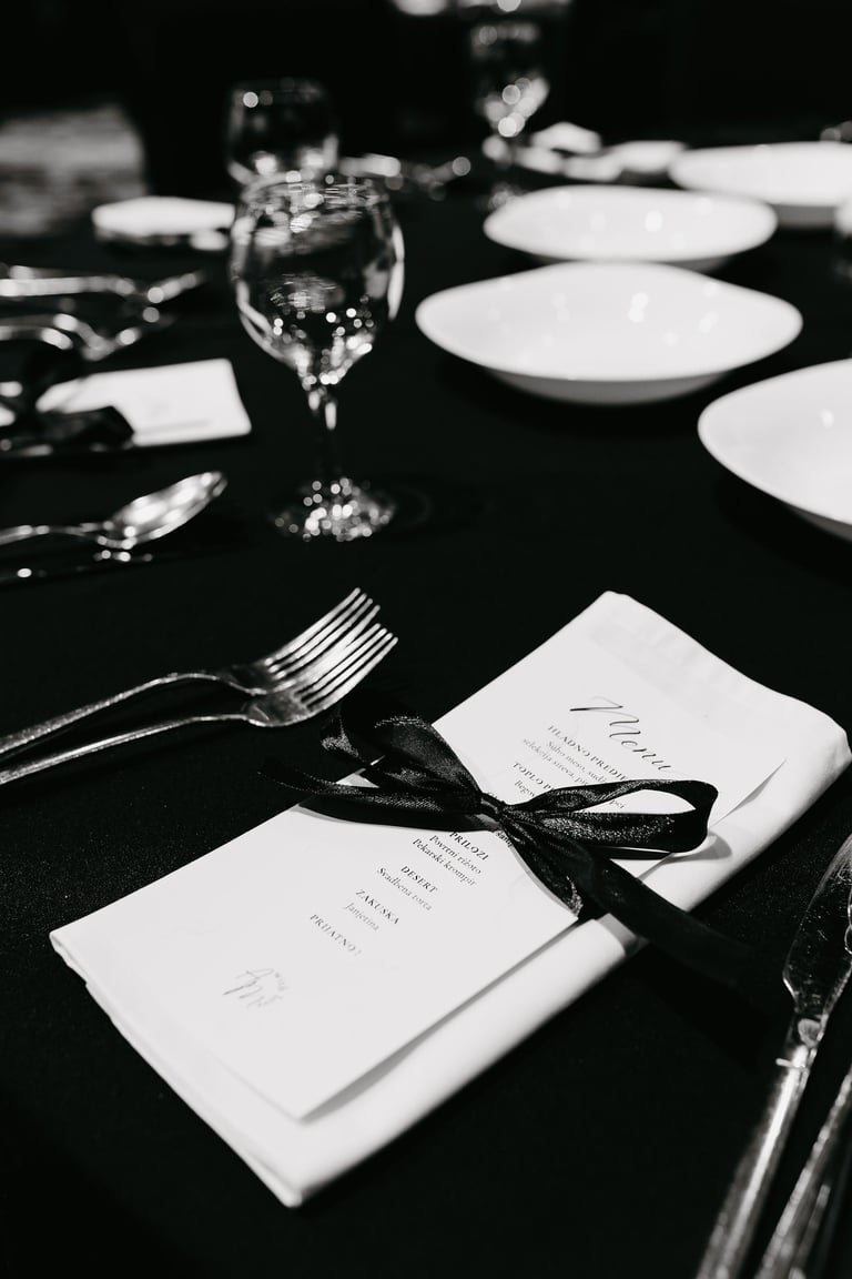 Printani materijal i dekorativni detalji dodatno upotpunjuju cjelokupni dojam vjenčanja i osiguravaju usklađenost svih elemenata. Izrađujemo kartice s menijem, rasporedom sjedenja, protokolom i pićima, kao i personalizirane zahvalnice za goste. Posebnu pažnju posvećujemo usklađivanju dizajna s ostalim dekorativnim elementima, koristeći kvalitetne materijale i sofisticirane tehnike printa. Svaki detalj izrađuje se s ciljem da vjenčanje izgleda besprijekorno i ostavi trajnu uspomenu.